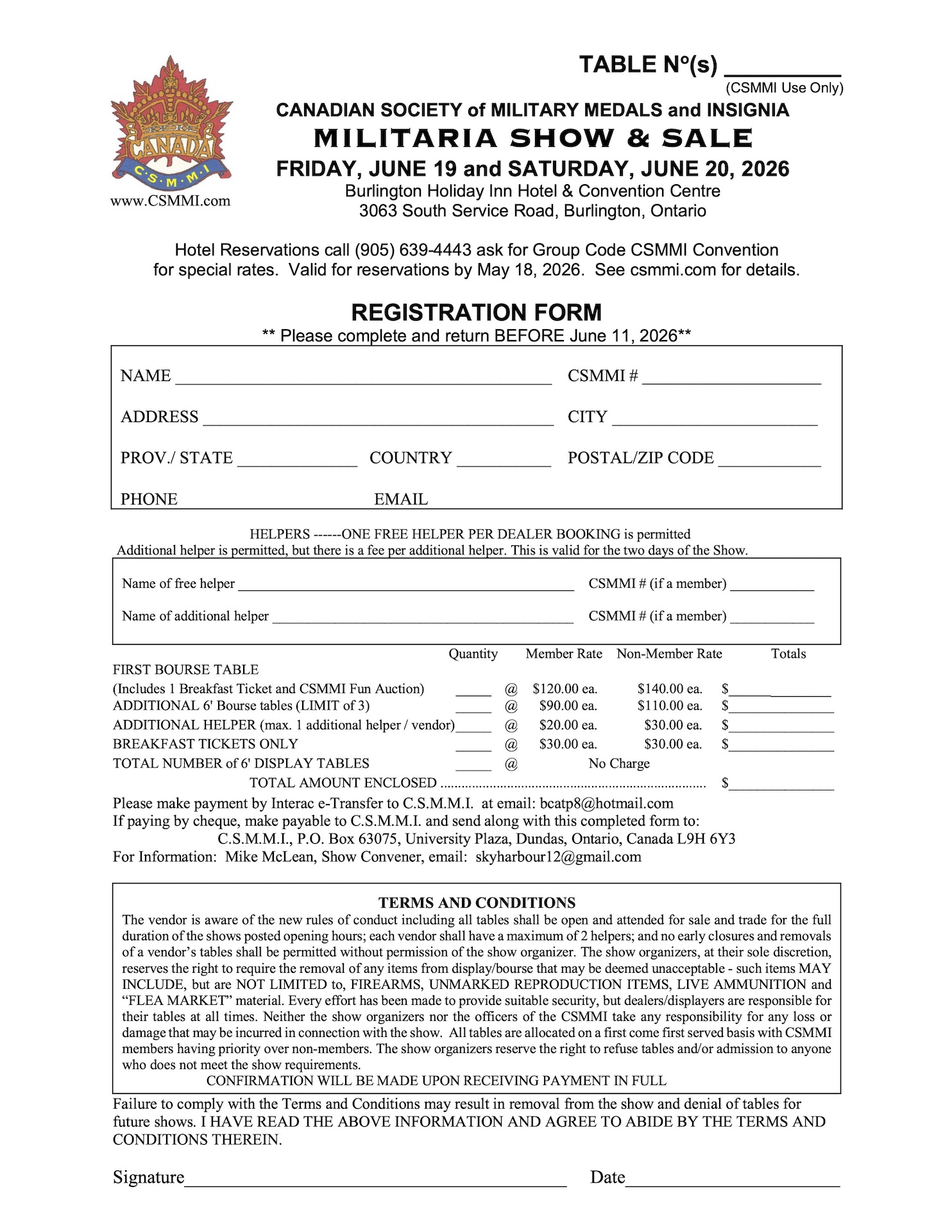 For eTransfer payments send to email: bcatp8@hotmail.com. Note name and reference Annual Militaria Show on the eTransfer comments. Scan and send completed registration form to: