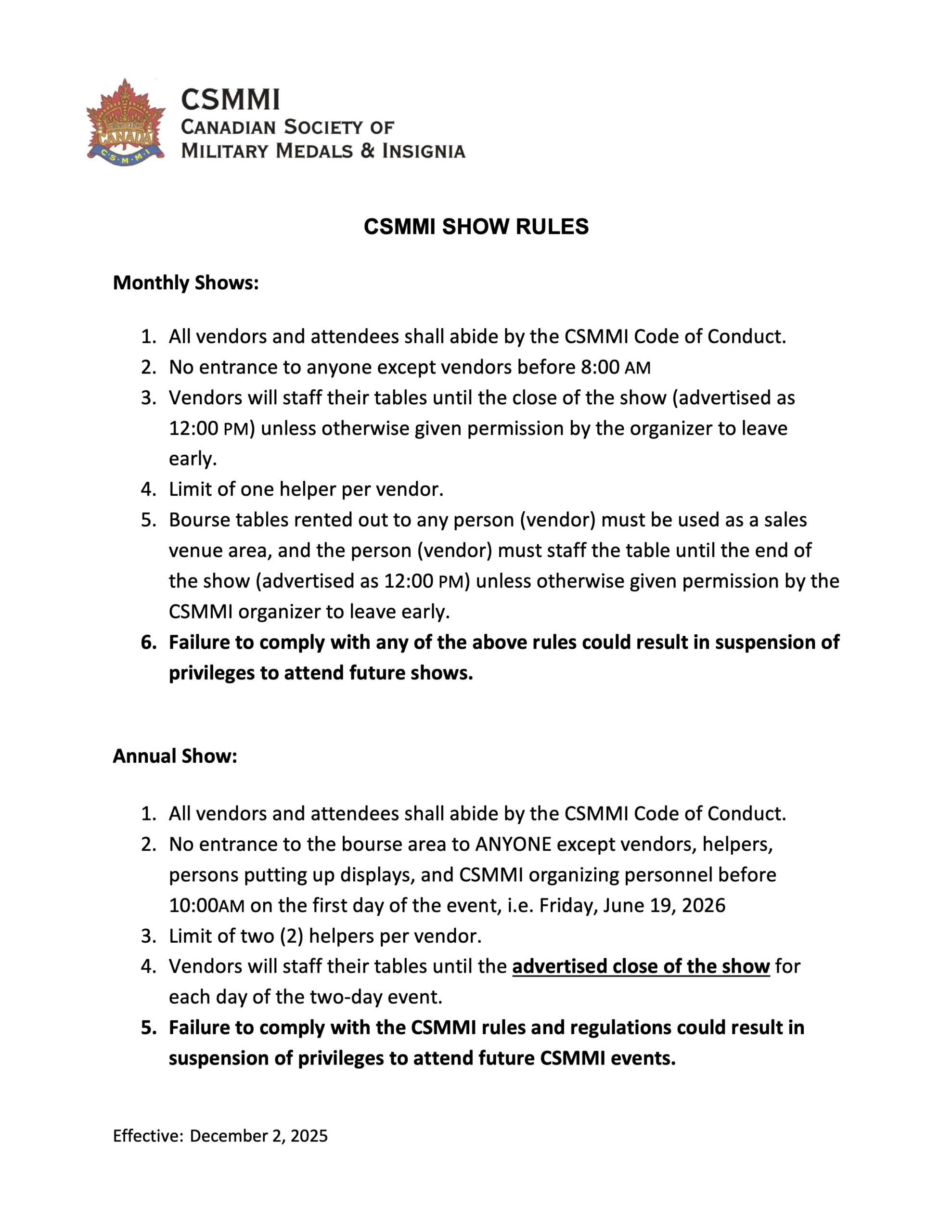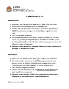 On May 20, 2025, any table space remaining will be rented to non-members on a first come first served basis. Tables are available only to Vendors selling and trading Canadian & Foreign militaria. Preference given to vendors dealing with the following items: orders, decorations & medals, metal and cloth badges, buttons, insignia, books, uniforms, helmets, historical items, war relics, swords, daggers, bayonets, field equipment, prints, trench art, military toys and toy soldiers.