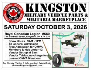 3rd Ontario Military Vehicle Association (OMVA) Fall Militaria & MV Parts Marketplace. Royal Canadian Legion, 734 Montreal St., Kingston, ON. A marketplace set-up amongst Canada's largest collection of military vehicles. www.omva.ca